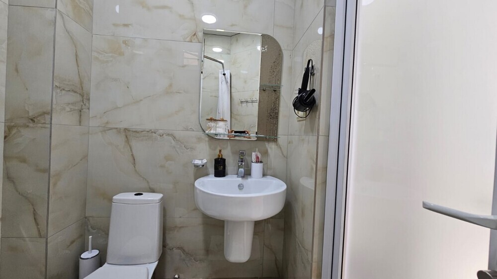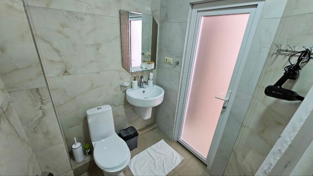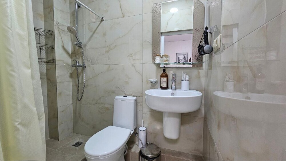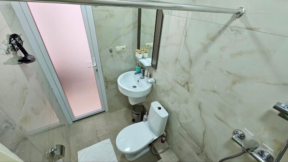 Индивидуальная ванная комната: душ, раковина, туалет.