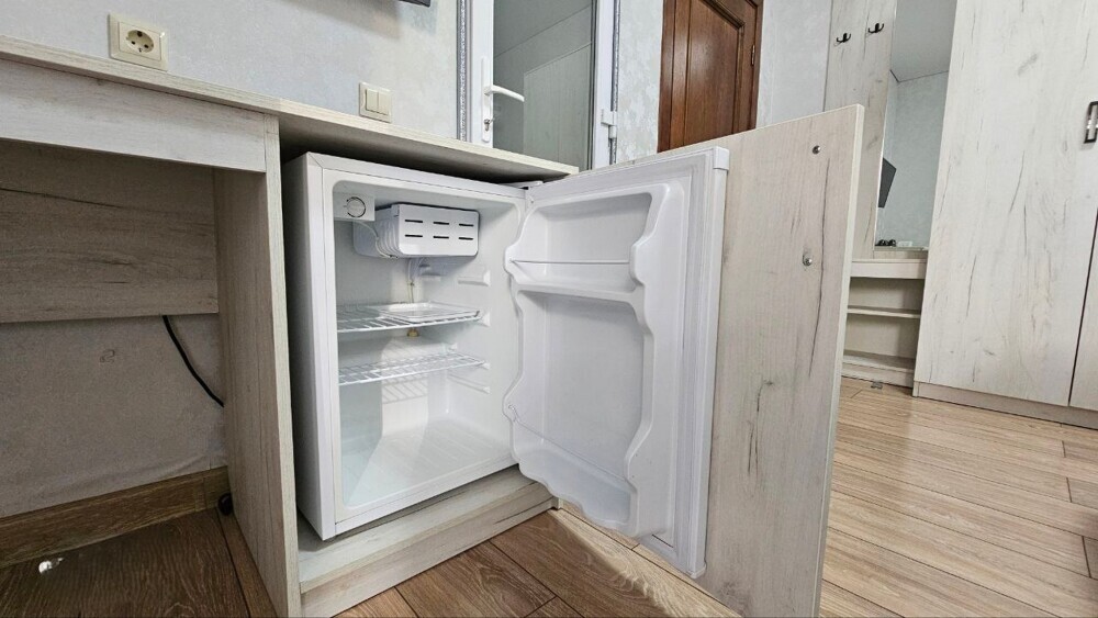 Имеется телевизор, кондиционер, шкаф, вешалка, зеркало, журнальный столик, холодильник, стулья, корзина для мусора.
