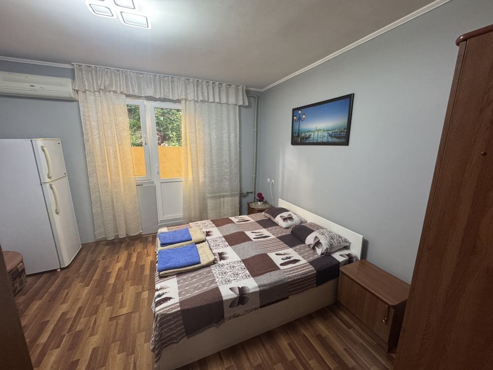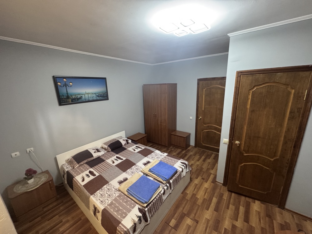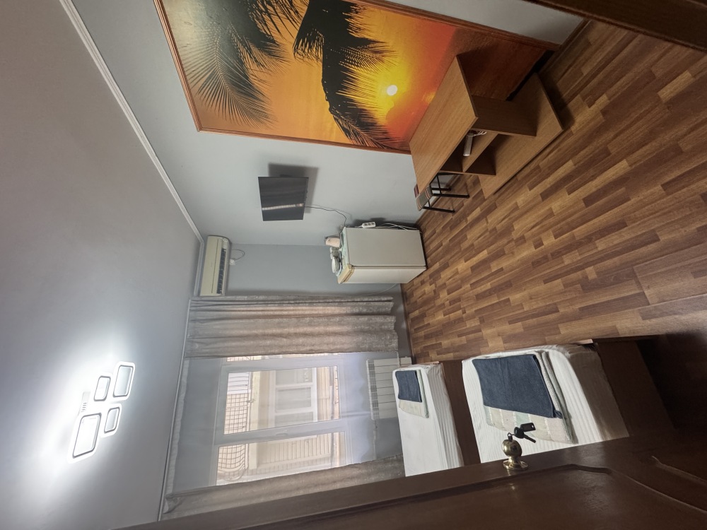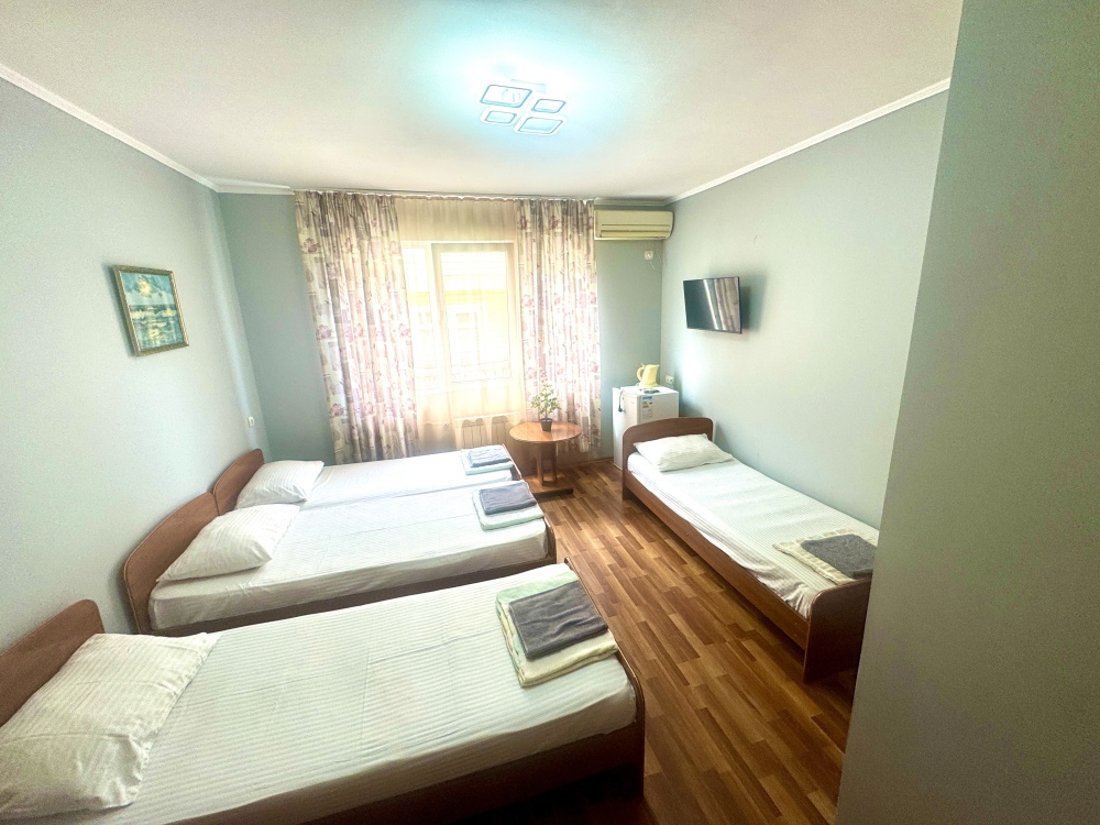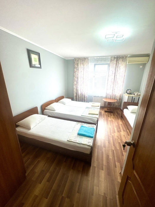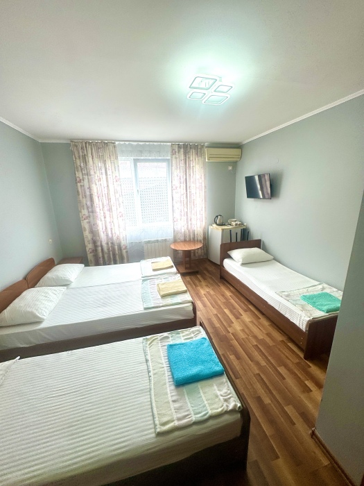 Номер на 4м этаже. В номере одна двуспальная кровать и одна односпальная кровать. Или две односпальные кровати и кресло кровать. Комплектацию номера уточняйте.