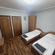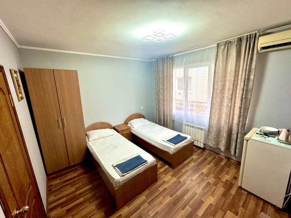 Номер на 4м этаже. В номере одна двуспальная кровать и две односпальные кровати. Или четыре односпальные кровати. Комплектацию номера уточняйте.