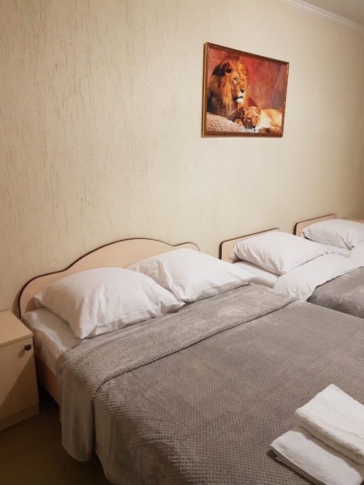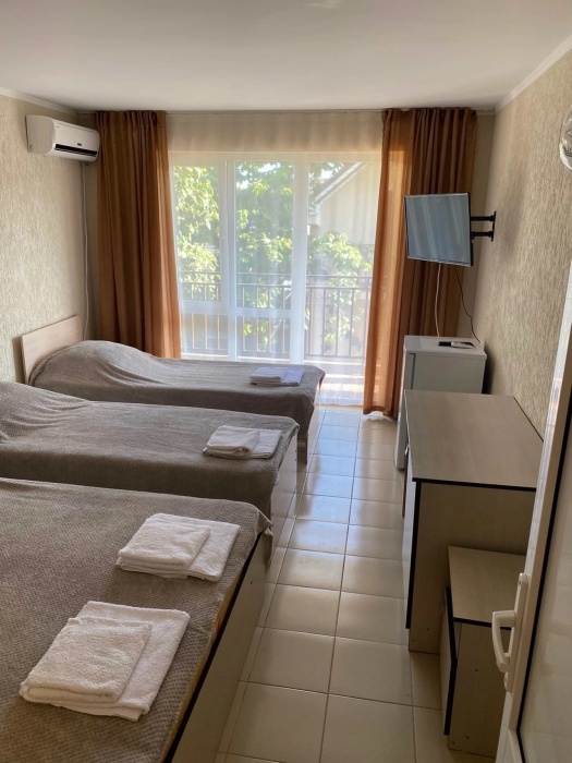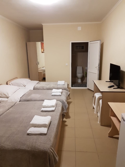 В номере двуспальные кровати (спальное место 160*200), односпальные кровати (спальное место 90×200), шкаф-ниша для одежды, зеркало, прикроватные тумбочки, телевизор, холодильник, кондиционер.