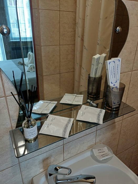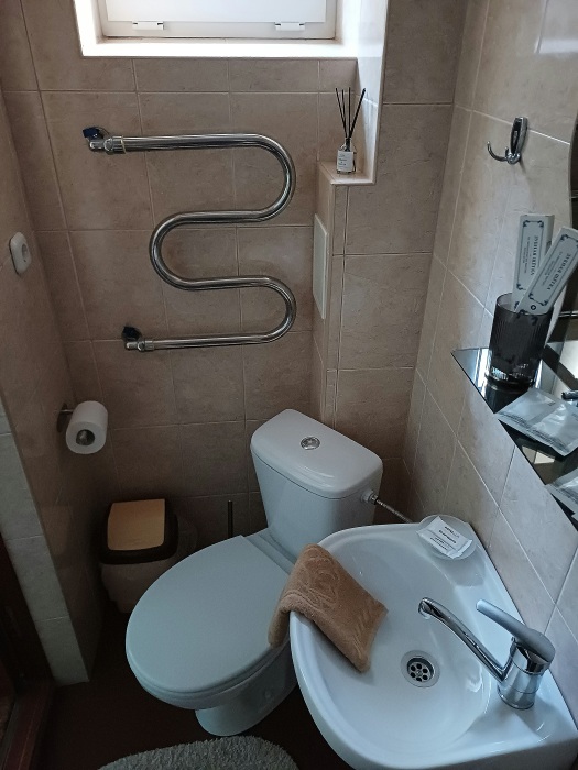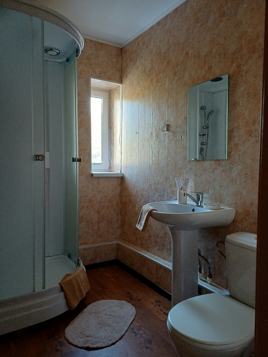 Трёхместный номер улучшенный расположен на 3 этаже. В номере:двуспальная и односпальная кровати, кресло раскладное, прикроватные тумбочки, шкаф, журнальный стол, телевизор, сплит-система.Wi-fi на всей территории. Санузел совмещённый в номере. Кухня общего пользования на 1-ом этаже со всем необходимым для приготовления пищи:посуда, столовые приборы, свч (07:00-22:00). Для гостей с автомобилем (при наличии места) бесплатная парковка под шлагбаумом.