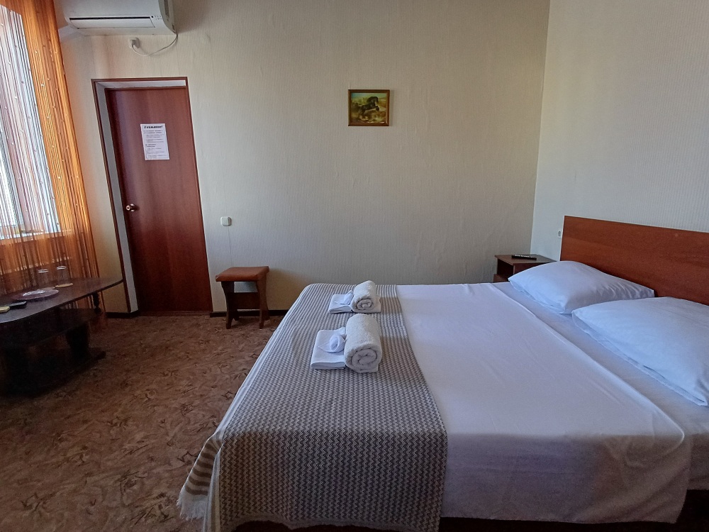 Каждый номер оснащен всем необходимым: спальные места, плоский телевизор, холодильник, сплит-система, санузел с душем, туалет, прикроватные тумбочки, журнальный стол.