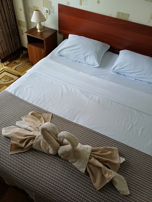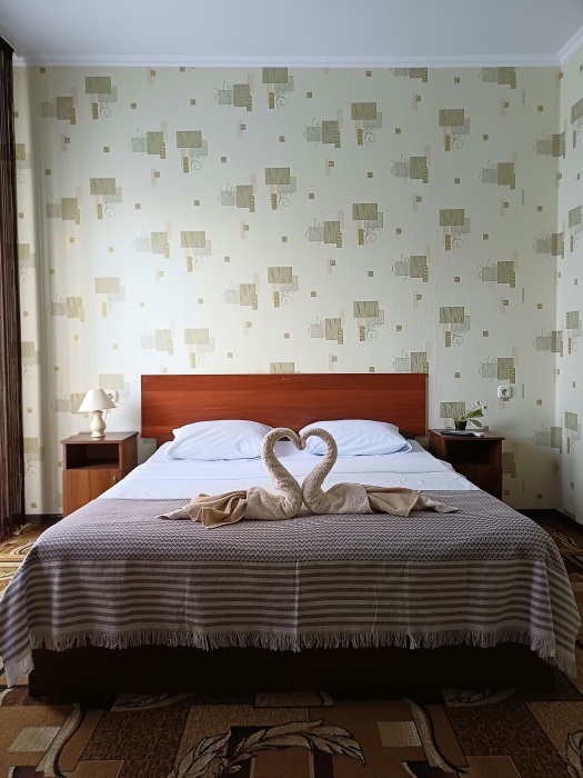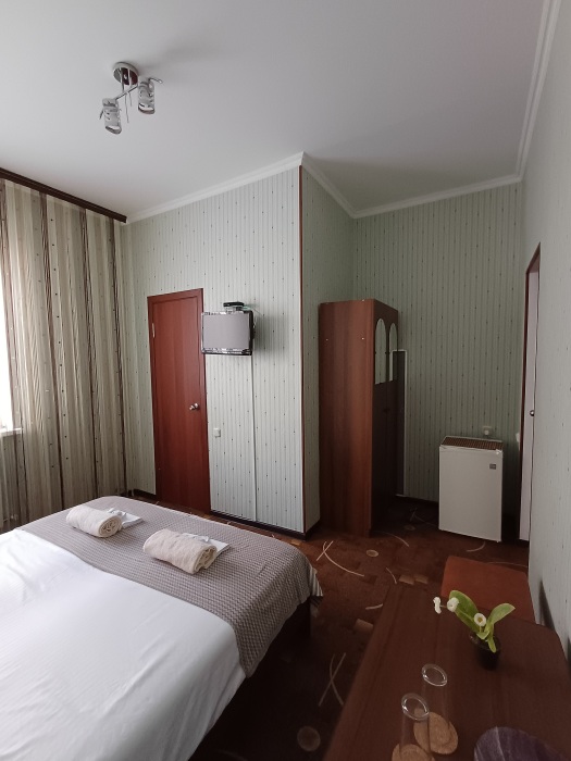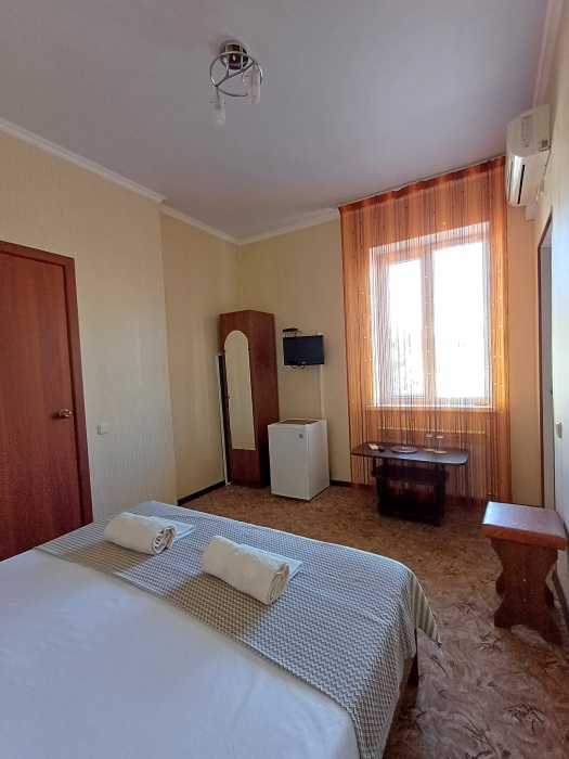 Двухместный номер расположен на 2,3 этаже. В номере:двуспальная кровать, прикроватные тумбочки, шкаф, холодильник, журнальный стол, сплит-система, телевизор, москитная сетка. Санузел совмещённый в номере. Wi-fi на всей территории. 1 этаже кухня общего пользования со всем необходимым для приготовления пищи:столовые приборы, посуда, свч (07:00-22:00). Для гостей с автомобилем (при наличии места) бесплатная парковка под шлагбаумом.