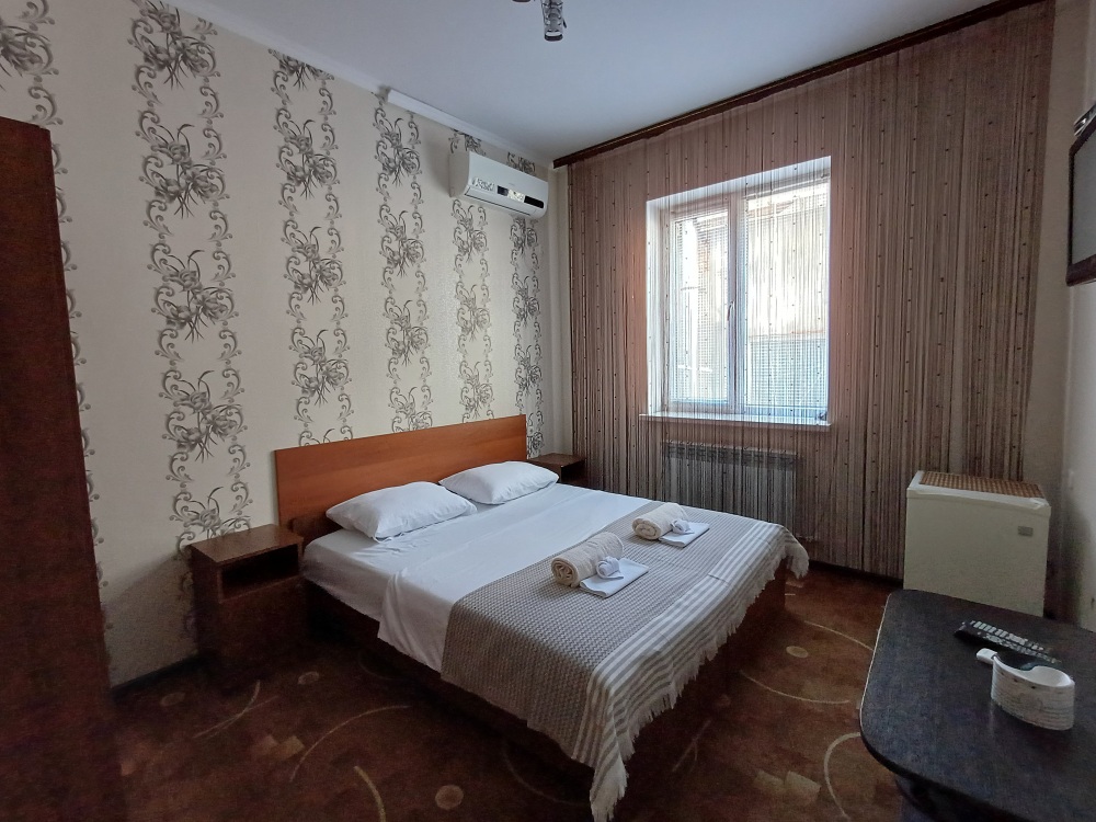 Номер с собственной ванной комнатой находитсяна1-ом, 2-ом этаже. Двуспальная кровать, прикроватные тумбочки, сплит-система, москитная сетка, телевизор, холодильник, плательный шкаф. Wi-fi на всей территории. Кухня общего пользования на 1-ом этаже со всем необходимым для приготовления пищи. У нас крытый двор с обеденными столами. Для гостей с автомобилем бесплатная парковка под шлагбаумом.