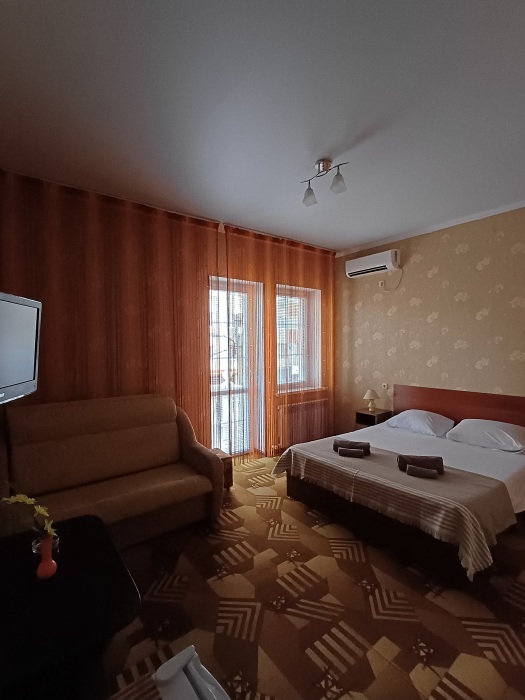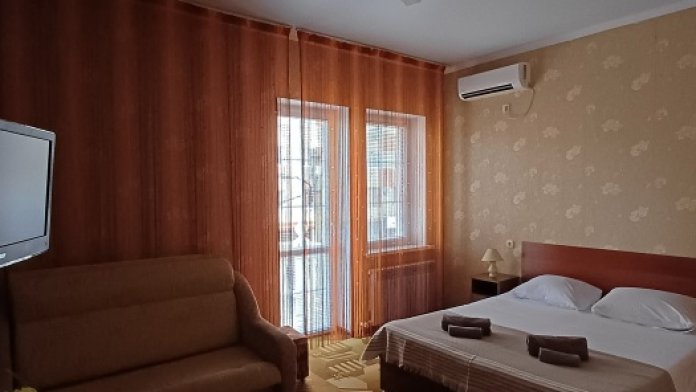 Двухместный номер с балконом расположен на 2 этаже. В номере: двуспальная кровать, сплит-система, телевизор, холодильник, журнальный стол, москитная сетка. Санузел совмещённый в номере. На 1-ом этаже кухня общего пользования со всем необходимым для приготовления пищи:посуда, столовые приборы, свч (08:00-22:00). Для гостей с автомобилем (при наличии места) бесплатная парковка под шлагбаумом.