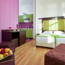 3-местный номер с балконом подойдет для комфортного размещения 3-4 человек оборудован кухонным уголком с обеденным столом, столовой посудой и эл.чайником. Для размещения 4-го гостя в номере есть пуф, трансформирующийся в полноценную дополнительную кровать, на балконе номера есть стол и стулья.