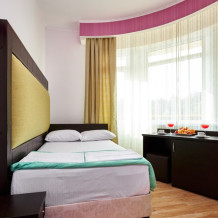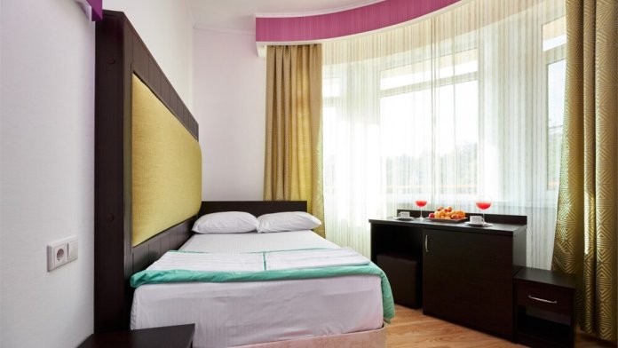 Одноместный номер Делюкс с видом на сад и горы имеет полутора спальную кровать 120 см шириной на которой допускается размещение 1 взрослого гостя и ребенка до 6-ти лет. За микроклимат в номере отвечает сплит-система, есть мини-холодильник, столовая посуда и столовые принадлежности. Курение в номере не допускается.