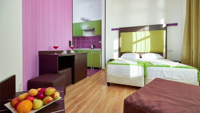 Просторный номер с гостиной зоной, оборудованной кухонной мебелью, посудой, потолочным вентилятором, вытяжкой, холодильником и телевизором с плоским экраном. Балкон с садовой мебелью. Гостям доступна премиум линейка отельной парфюмерии, банные халаты. В спальне гости могут воспользоваться большим Смарт ТВ с плоским экраном и доступом в интернет.
