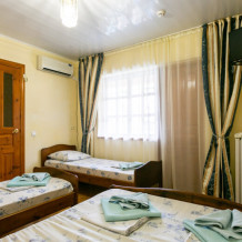 27 номеров гостиницы оснащены всем необходимым: телевизор, сплит-система, холодильник, сейф, удобства в номере, полотенца для внутреннего пользования, индивидуальная посуда. В каждом номере набор полотенец. Горячей и холодной водой здание обеспеченно полностью, благодаря собственному газовому и насосному оборудованию. Смена постельного белья и уборка в номерах осуществляется каждые 5 дней .