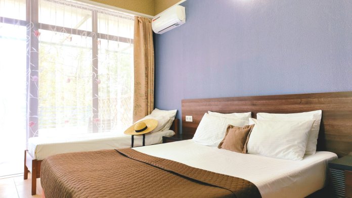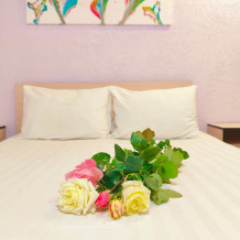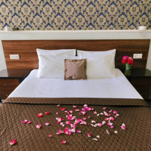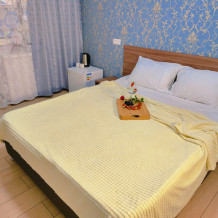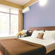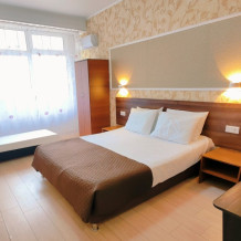 Оснащение номера: удобная двуспальная кровать, шкаф для хранения одежды, тумбочка или журнальный столик, мини-холодильник, телевизор, чайник, кружки. Комфортную температуру обеспечивает сплит-система. В ванной комнате: набор одноразовой косметики (гель, шампунь, мыло). На личном балконе установлена летняя мебель.