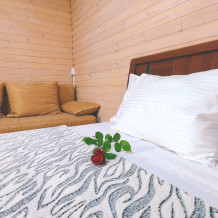 Оснащение номера: двуспальная кровать, односпальный диван, шкаф для хранения одежды, тумбочки, журнальный столик, стол, зеркало, мини-холодильник, телевизор, чайник, кружки. Комфортную температуру обеспечивает сплит-система. В ванной комнате: набор одноразовой косметики (гель, шампунь, мыло). Терраса с летней мебелью.