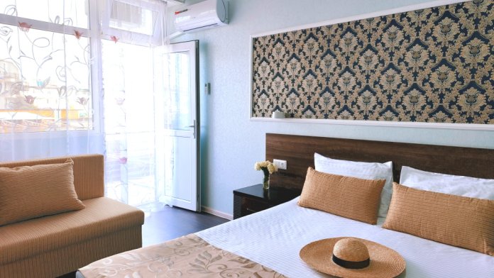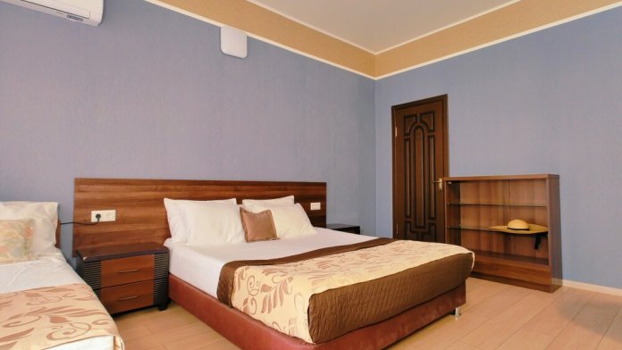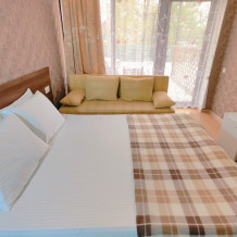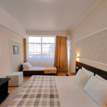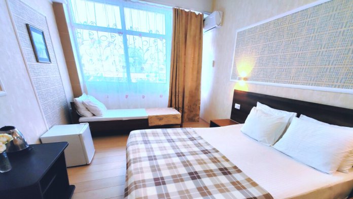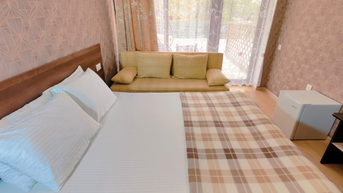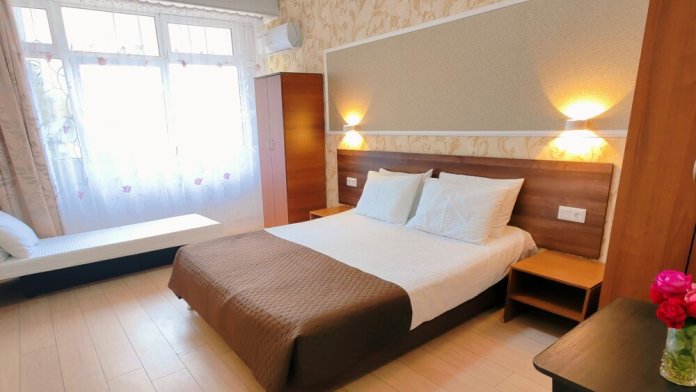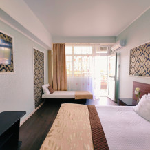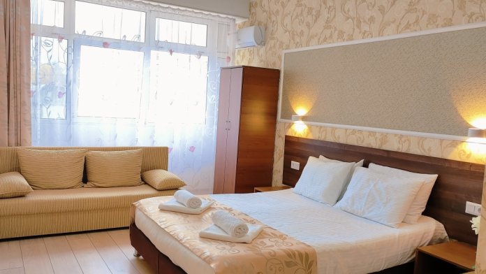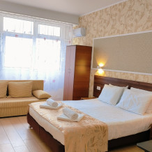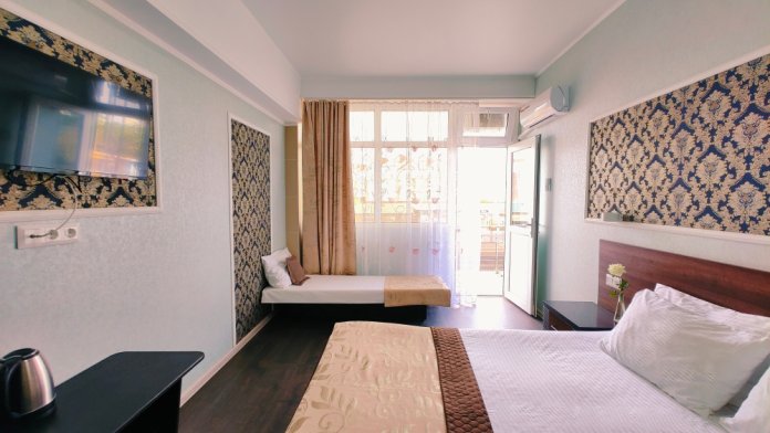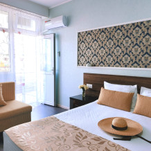 Оснащение номера: удобная двуспальная кровать и диван-кровать, шкаф для хранения одежды, тумбочка или журнальный столик, мини-холодильник, телевизор, чайник, кружки. Комфортную температуру обеспечивает сплит-система. В ванной комнате: набор одноразовой косметики (гель, шампунь, мыло). На личном балконе установлена летняя мебель.