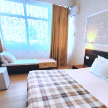 Впечатления от пребывания весьма положительные. Номера чистые, ежедневная уборка восхищает. Кровати комфортные, душевые удобные. Наличие электрочайника и холодильника - большой плюс. Белье и полотенца всегда свежие. Есть несколько замечаний относительно урн. Хотелось бы видеть урны возле каждой скамейки для удобства, чтобы не приходилось искать мусорные баки. Было бы замечательно установить туалет на территории бассейна, чтобы взрослые, пользующиеся этим местом, не мешали детям. Отдельное внимание заслуживает кулинарное предложение. Выбор вполне приемлемый. Хочется обратиться к поварам с просьбой: не переусердствовать с приправой "хмели-сунели" в мясных и рыбных блюдах. Разнообразие приправ может перебить оригинальный вкус блюд. Хочется также обратить внимание родителей на контроль за пищей и избегать излишков, которые потом выбрасываются, лишая других возможности насладиться вкусным. Это, вероятно, зависит от менталитета посетителей, считающих, что при оплате "все включено" им все и везде полагается. Отдельная благодарность аниматору Владу, который целый день развлекает детей. Желаем ему терпения и успехов, особенно когда он старается развеселить взрослую аудиторию на дискотеках. Наличие большого бассейна иногда делает море неактуальным для детей. Вокруг много торговых точек, где можно приобрести все необходимое. Море находится очень близко, пляж отличный. Желаем вам удачи и процветания!
