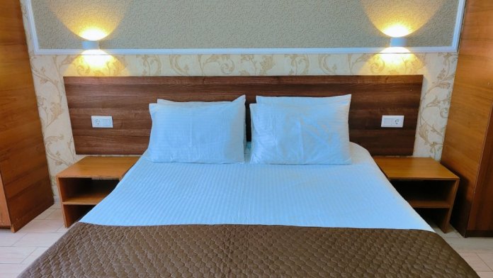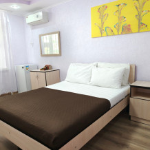 Оснащение номера: двуспальная кровать, шкаф для хранения одежды, тумбочка или журнальный столик. Для комфорта установлена: сплит система, мини-холодильник, телевизор, чайник, кружки. В ванной комнате: набор одноразовой косметики (гель, шампунь, мыло).