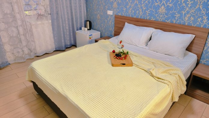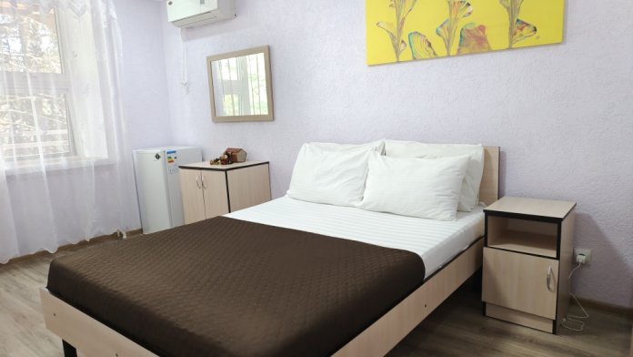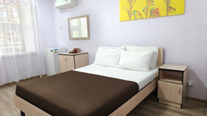 Отличное местечко! У нас была своя небольшая зона отдыха с уютными лавочками, где можно было расслабиться в тени. Для детей есть отдельная игровая комната с качелями и горкой. Большой бассейн с зоной для малышей, рядом с ним - навес от солнца и лежаки, а у бассейна есть даже мини-бар. В столовой подают вкусные блюда, включая плов, рыбу, тушеные овощи и выпечку. Ежедневная уборка в номере! Море всего в 5 минутах ходьбы через улочку Морскую, где работают различные торговые палатки. Парковка на территории платная, но есть мангал для желающих пожарить шашлычки. Мы выбрали это место, потому что можно привезти с собой животных. В радиусе 5 минут ходьбы много магазинов, ресторанчиков, аптек и салонов красоты, а также аквапарк и парк аттракционов. Очень понравилось! Наш номер был на третьем этаже с общей большой террасой. Каждый номер имел свою небольшую территорию, огороженную деревянными перегородками, с качелями и лежаком. Персонал всегда был вежливым и приветливым!