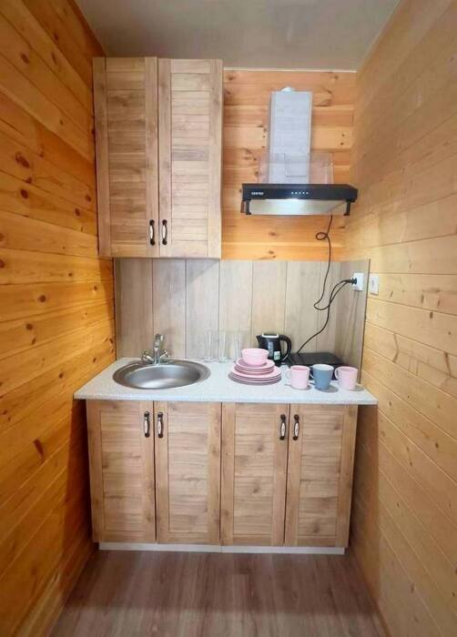 - Кухонный гарнитур с мини-плитой и вытяжкой;