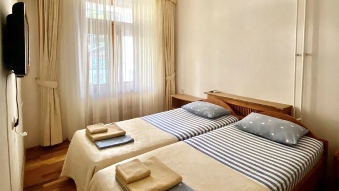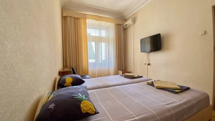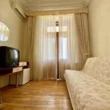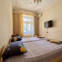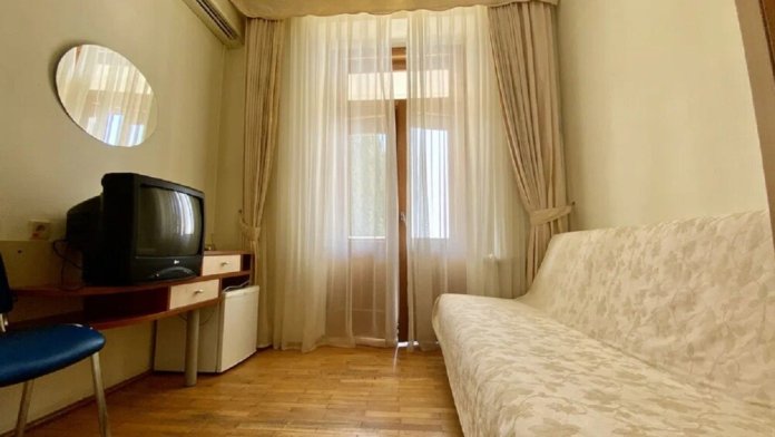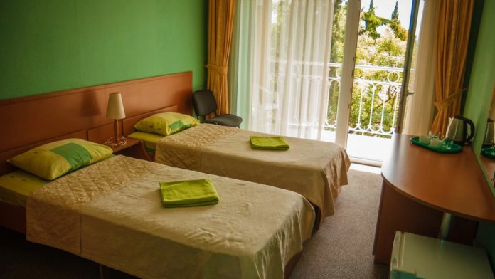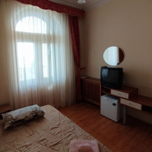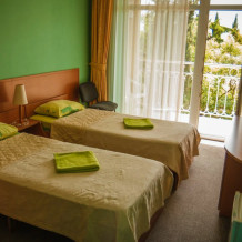 В номере одна двуспальная или две односпальные кровати. На первом этаже располагаются номера, с видом на парк или море, с балконами. Летом в номерах всегда прохладно.