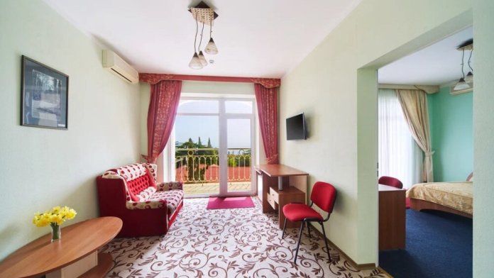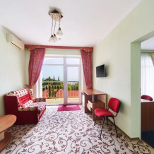 Отель занимает красивый трехэтажный особняк (корпус 1 и корпус 2) с белоснежными колоннами и балюстрадами, расположенный среди зеленого парка с кипарисами. Индивидуальные террасы и комфортные двухкомнатные номера, из которых открывается великолепный живописный вид на город, горы и ласковое море, Вас не оставят равнодушными. Само здание так и напоминает дворец, в котором мы сделаем все, чтобы Вы чувствовали себя по-королевски. Вокруг отеля - парковая зона, где Вы можете отдохнуть и насладиться чистым воздухом, после прогулки расслабиться у летнего открытого бассейна с шезлонгами, расположенного на территории отеля. Гостям доступен высокоскоростной беспроводной интернет как на территории отеля, так и в номерах, охраняемая парковка возле корпуса.