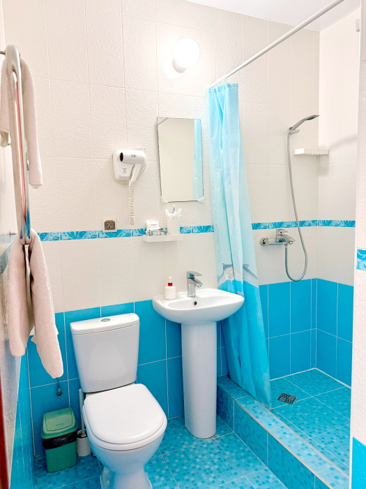 Однокомнатный номер с отдельным входом. Номер оснащен: двуспальная кровать и односпальная кровать, прикроватные тумбочки, шкаф, ТВ, кондиционер, мини-холодильник, бутилированная вода. Ванная комната: душ, раковина, туалет, полотенцесушитель, фен, гигиенические средства, халат, тапочки.