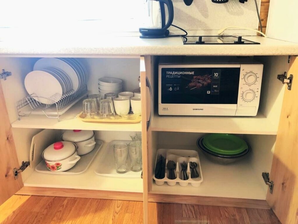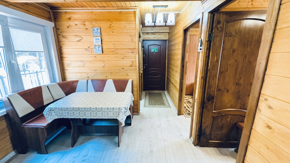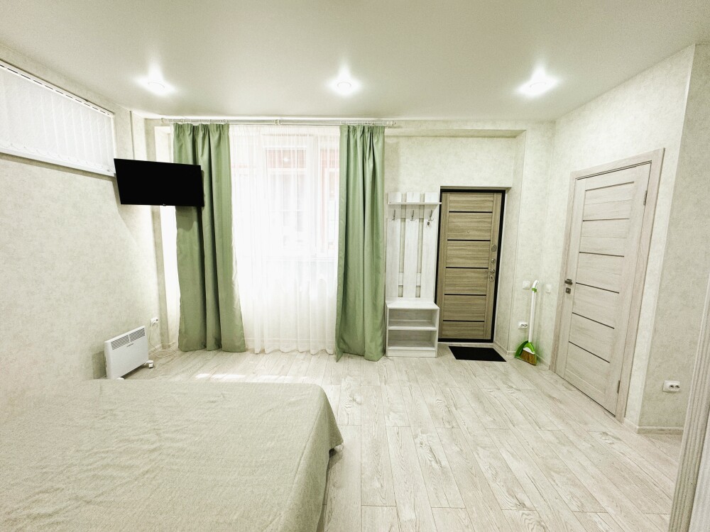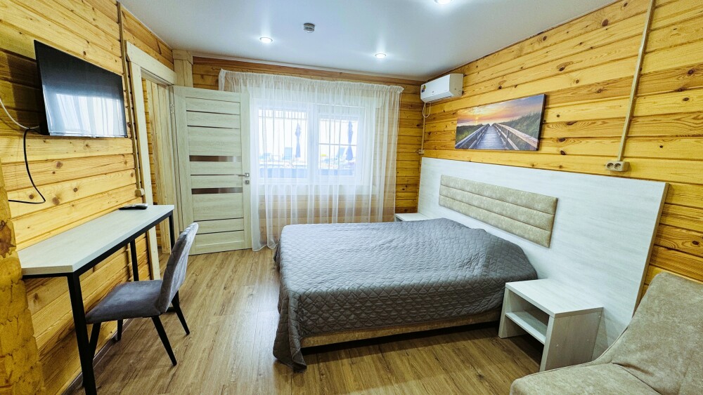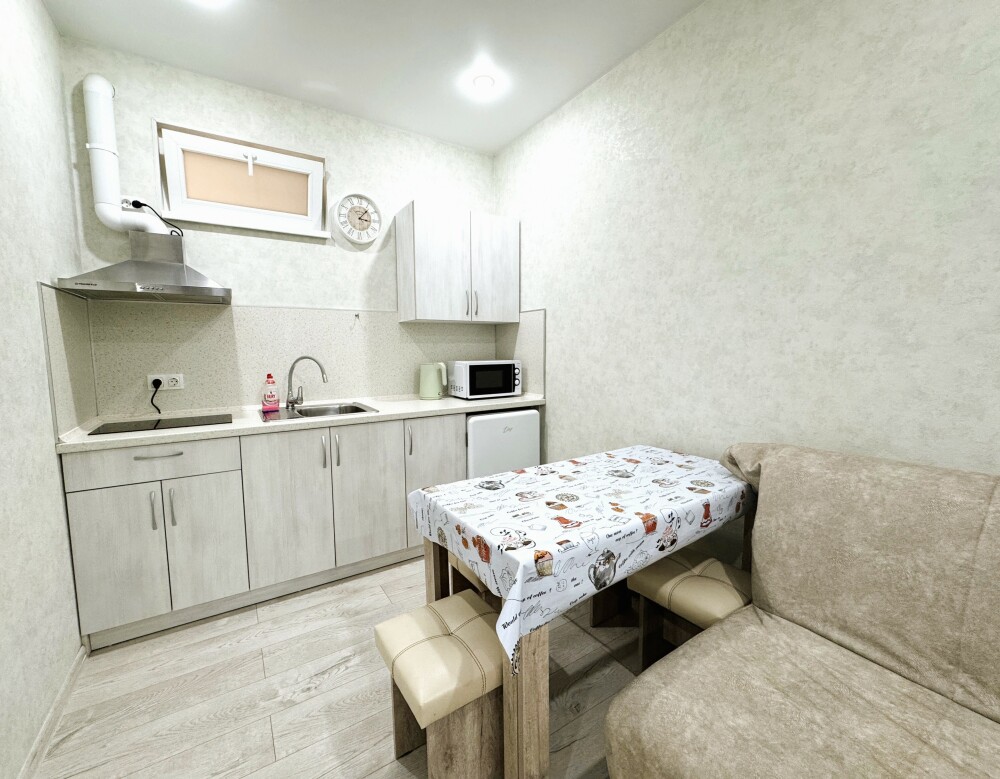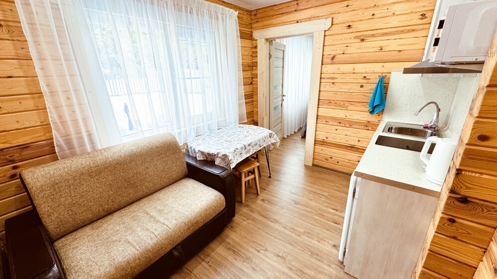 Люкс с собственной кухней. Кухня укомплектована всей необходимой кухонной техникой, посудой. В номере одна большая комната с двуспальной кроватью и ортопедическом диваном кроватью для двоих человек. Вторая комната-кухонная зона с дополнительным местом-креслом кроватью.