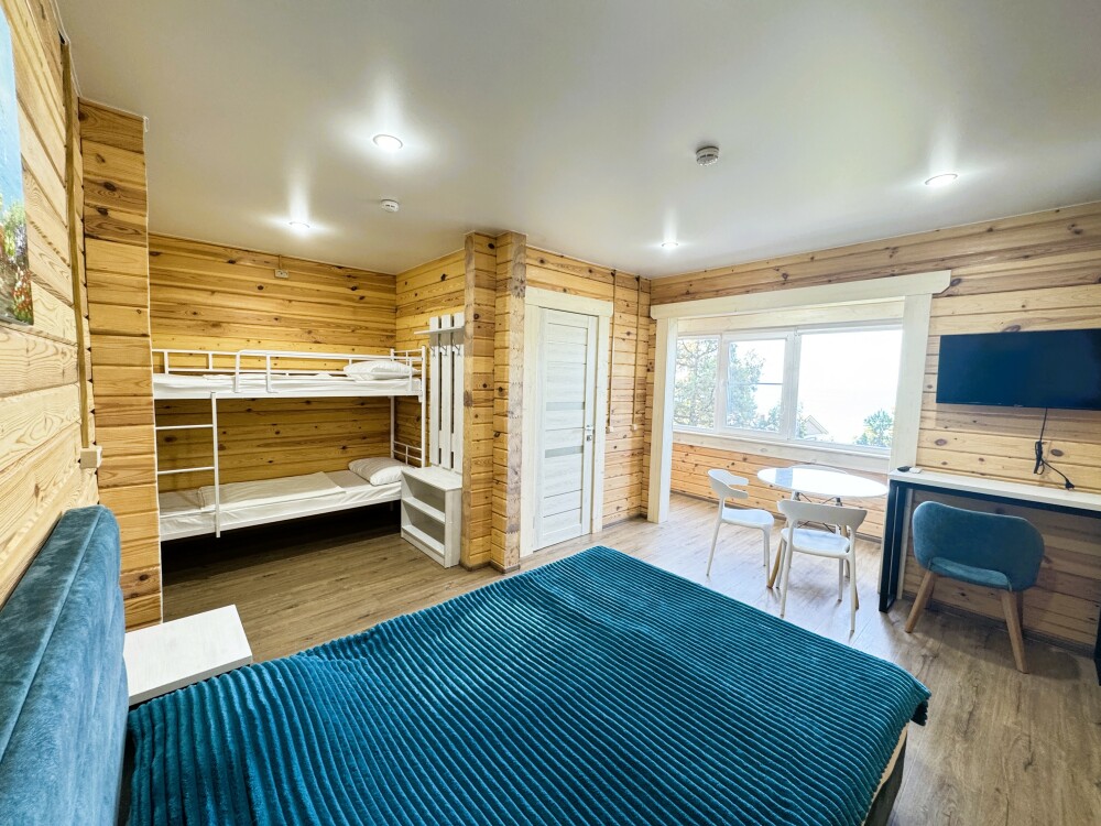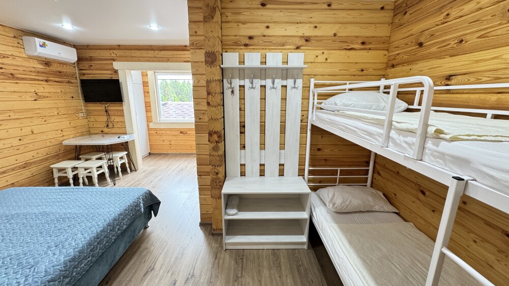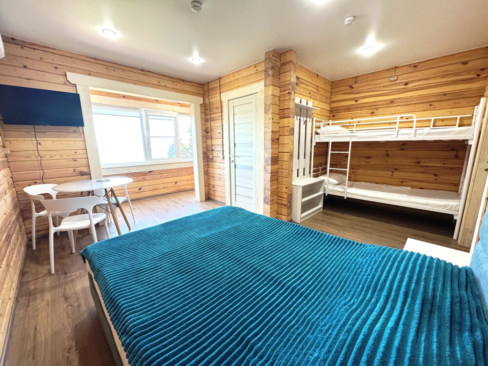 В номере расположена одна большая двуспальная кровать и двухъярусная кровать с двумя спальными местами длиной 200 см. и шириной 80 см.
