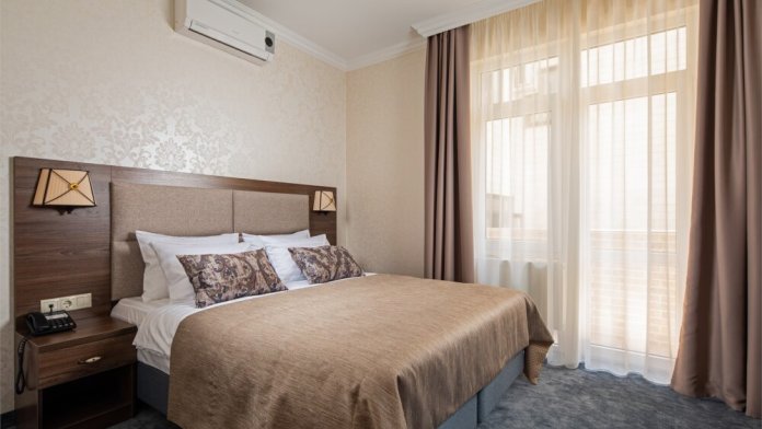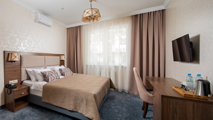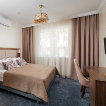 Номер 1 категории Стандарт без балкона в стиле прованс с мебелью, изготовленной по индивидуальному дизайну. Площадь номеров от 14 до 16 кв.м. В номере: 2 раздельные кровати размером 90*200, 1 кровать размером 180*200 см или 1 кровать 160*200 см с ортопедическим матрацем, прикроватные тумбочки, телефон, ЖК телевизор с цифровым ТВ, гардероб, стол, холодильник, Wi-Fi. В ванной комнате душевая кабина, санузел, комплект полотенец, фен и туалетные принадлежности. В номерах категорически запрещается курить.