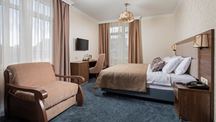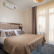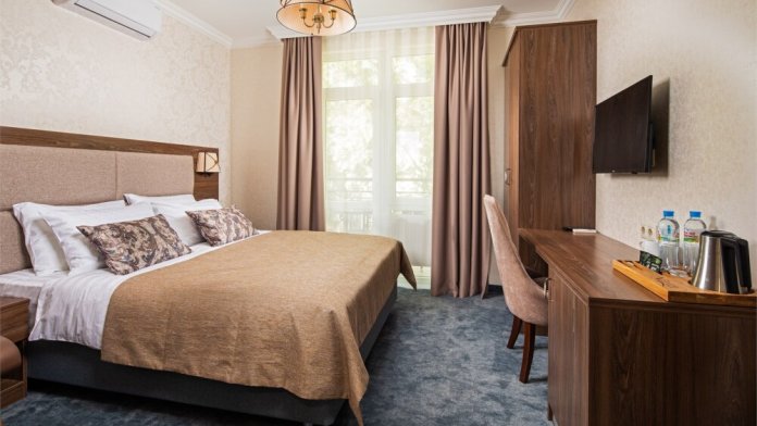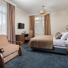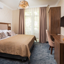 Номер высшей категории Люкс 2-комнатный в стиле прованс с мебелью, изготовленной по индивидуальному дизайну. Площадь номера 35 кв.м. В номере: 2 кровати размером 180*200 см и кровать размером 160*200 см с ортопедическим матрацем, прикроватные тумбочки, телефон, ЖК телевизор с цифровым ТВ, гардероб, стол, холодильник, Wi-Fi. В ванной комнате душевая кабина, санузел, комплект полотенец, фен и туалетные принадлежности. В номере балкон. В номерах категорически запрещается курить.
