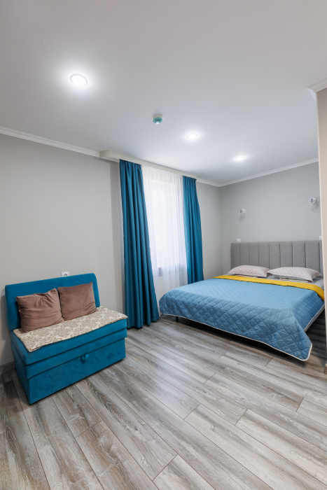 - Мебель: Двуспальная кровать (размеры ~180x200 см), односпальная кровать журнальный столик, стол со стульями, шкаф.