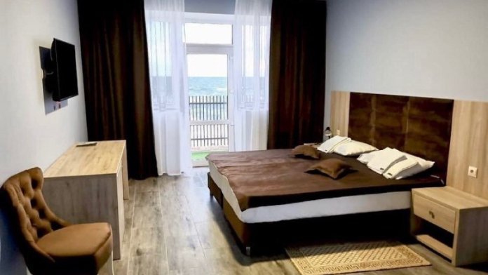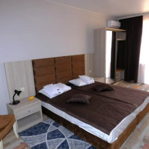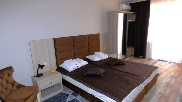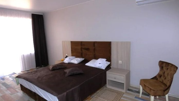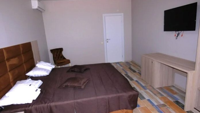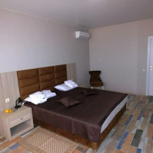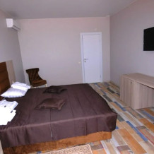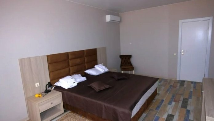 В номере кровать 180*200 (можно ставить раздельно) +дополнительное место 1.5 кровать с ортопедическим матрасом, прикроватные тумбы и коврики, стол ,стулья,чайник, холодильник,цифровое ТВ,сплит, шкаф для вещей и обуви, сейф, Wi-fi, туалет, душ.