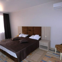 В номере кровать 180*200 (можно ставить раздельно) +дополнительное место 1,5 спальная кровать с ортопедическим матрасом, прикроватные тумбы и коврики, стол ,стулья,чайник, холодильник,цифровое ТВ,сплит, шкаф для вещей и обуви, сейф, Wi-fi, туалет, душ. Размещение в номере до 3х человек.