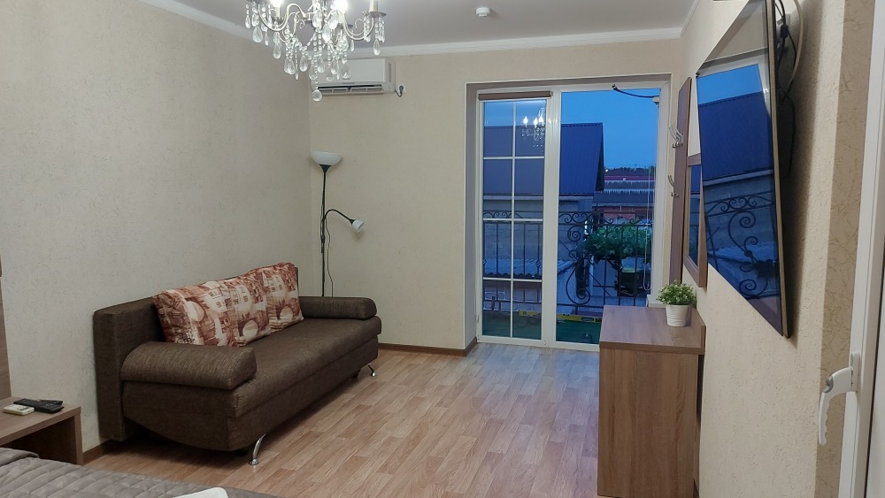 Номер Люкс двухкомнатный с кухней. Оборудован всем необходимым для комфортного отдыха и проживания. Номер находится как на первом, так и на втором этаже. Номер укомплектован двумя кондиционерами, два смарт TV 43», цифровое тв, Wi-Fi, холодильник, эл.чайник, индукционная плитка, вся необходимая посуда, фен, сейф. Санузел с душевой кабиной. На балконе столик с креслами.