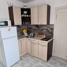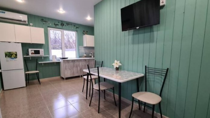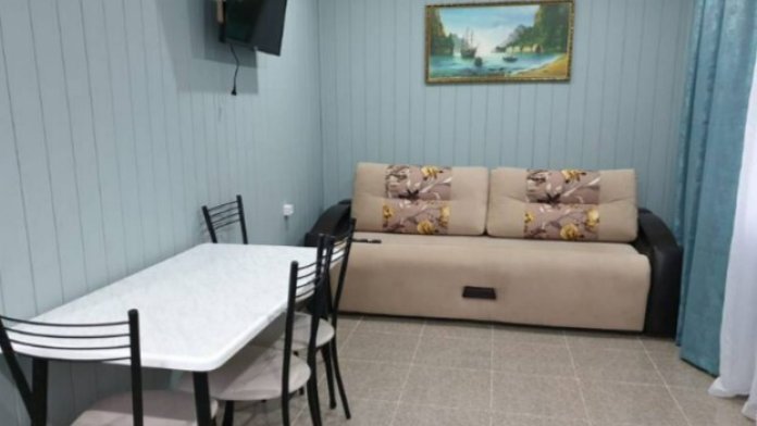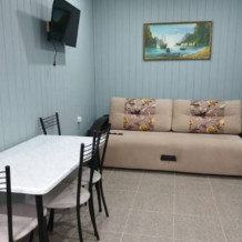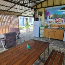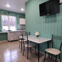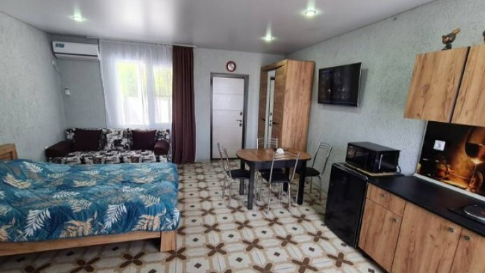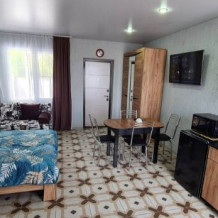На огороженной территории в новом одноэтажном доме сдаются апартаменты с кухней, зоной отдыха, санузлом и душем и апартаменты-студия, они рассчитаны на 4 человека, за дополнительную плату можем установить дополнительное место. В апартаментах имеется сплит-система, телевизор (на Ваш выбор спутниковое или обычное ТВ), микроволновая печь, электрическая плита, чайник, кухня со всей необходимой посудой, холодильник. Водоснабжение постоянное (на территории расположена собственная скважина), горячая вода в каждом номере от водонагревателя. Каждый номер имеет свою зону барбекю.