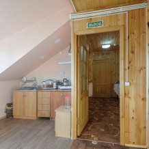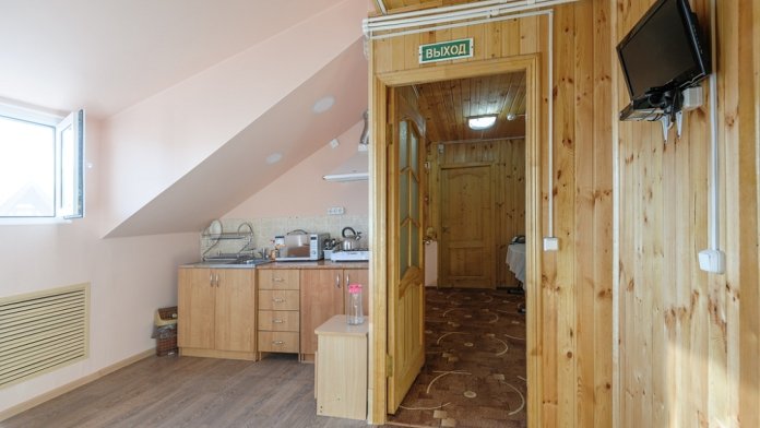 На первом этаже общая кухня, столовая, номера. На втором - номера. Третий этаж занимают апартаменты из двух комнат, раздельного сан. узла и кухни.