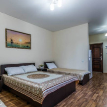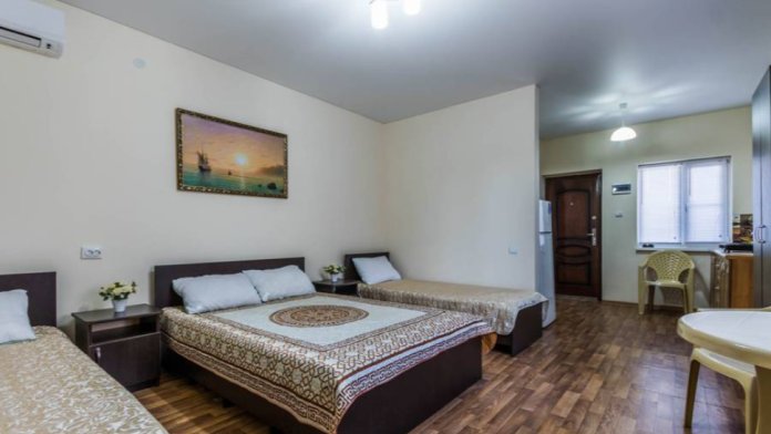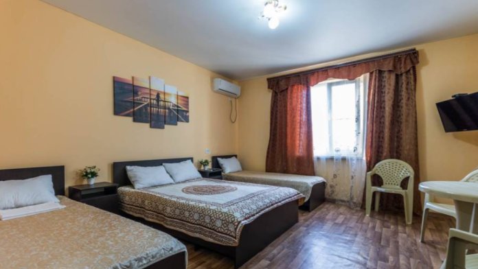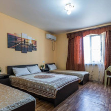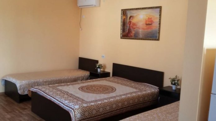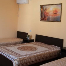 Мы рады предложить Вам просторные светлые номера, общая площадь номера 30 кв. метров. В каждом номере двуспальная и две односпальные кровати, санузел, большой ЖК телевизор, сплит-система, шкаф, кухня со всеми принадлежностями, двухкамерный холодильник, широкий балкон, возможность поставить столик на балконе. Во дворе мангал, WI-FI. Предоставляются постельное бельё и полотенца.
