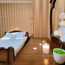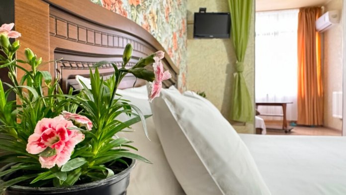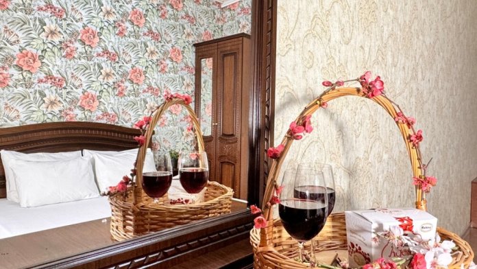Номер оснащен: двуспальная кровать, прикроватные тумбочки, шкаф, туалетный столик, зеркало, стул, журнальный столик, телевизор, мини-холодильник, кондиционер.