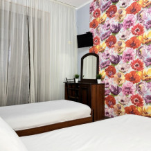Четырехместный номер комфорт с видом на столовую и территорию отеля. Номер оснащен: двуспальная кровать или две односпальные кровати, диван-кровать (140 см), прикроватные тумбочки, туалетный столик, зеркало, стул, журнальный столик, шкаф, телевизор, мини-холодильник, кондиционер.