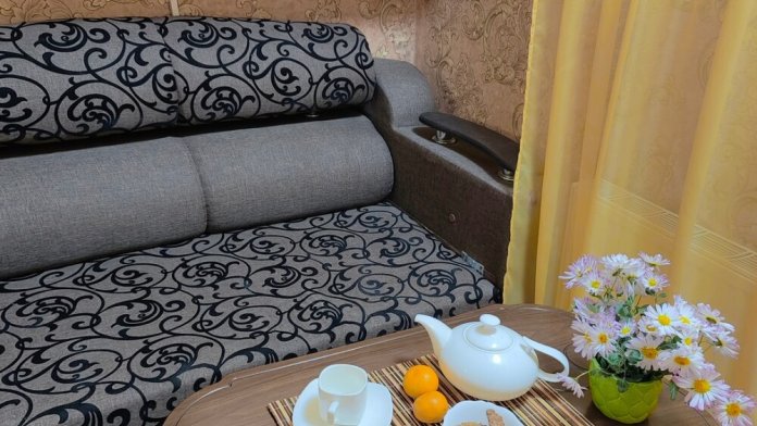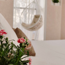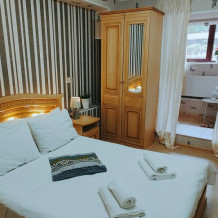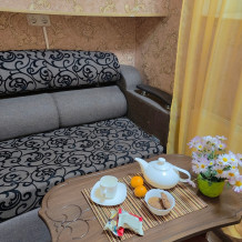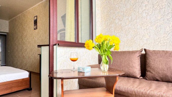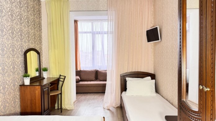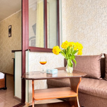 Просторный однокомнатный номер с возможность размещения до 5ти человек. В номере имеется: двуспальная кровать, диван-кровать, кресло-кровать, прикроватные тумбочки, журнальный столик, шкаф, телевизор, мини-холодильник, кондиционер. На лоджии находится кресло-кокон.