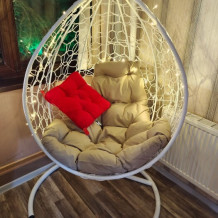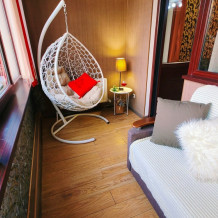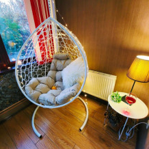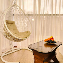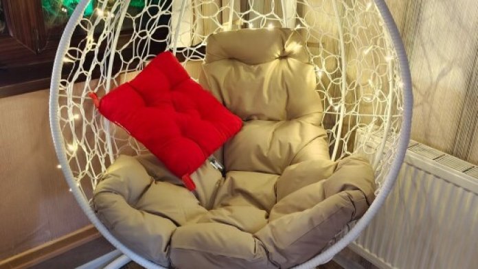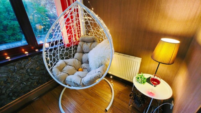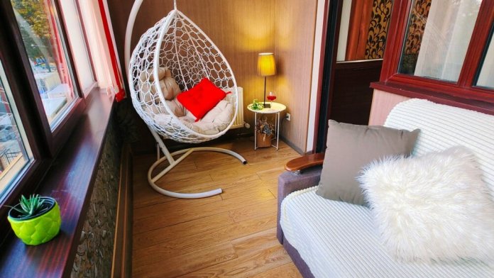 На лоджии находится кресло-кокон, кресло-кровать, журнальный столик.