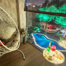 В номере имеется: двуспальная кровать, диван-кровать, прикроватные тумбочки, журнальный столик, шкаф, телевизор, мини-холодильник, кондиционер. На лоджии находится кресло-кокон
