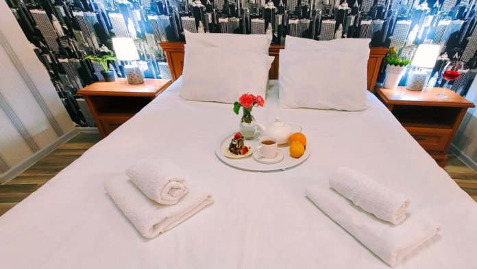 Номер оснащен: двуспальная кровать или две односпальные кровати, кресло-кровать, прикроватные тумбочки, шкаф, стул, журнальный столик, телевизор, мини-холодильник, кондиционер.