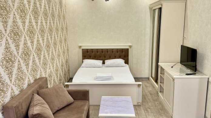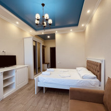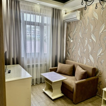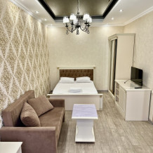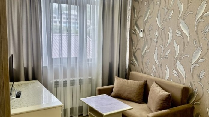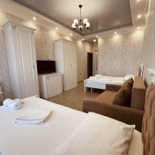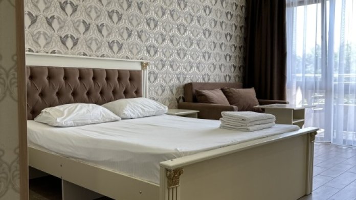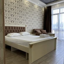 Номер люкс с балконом . В номере двуспальная кровать и диван кровать ( полуторка ) Могут расположиться 3-4 гостя . Вс я необходимая мебель и техника . Современный номер для комфортного отдыха