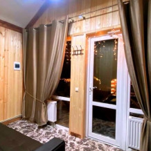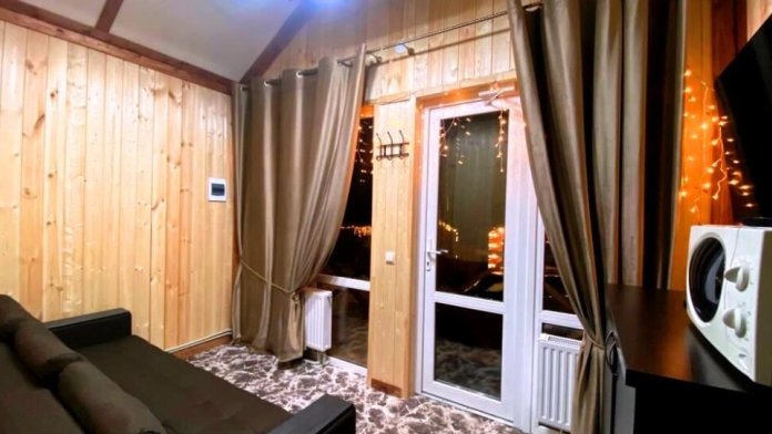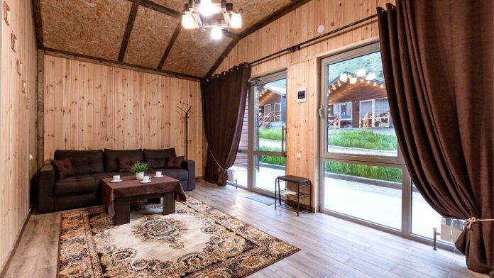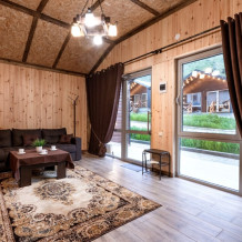 В коттедже одна спальная комната с кроватью трансформер, гостинная с мягким раскладным диваном, телевизором и небольшой кухонной зоной. Мини-кухня включает электрический чайник, микроволновую печь, варочную панель, набор посуды и холодильник. Ванная комната с большой душевой кабиной, где есть все необходимые принадлежности (полотенца, фен, тапочки, косметические наборы). В каждом коттедже, индивидуальное отопление и теплые полы.