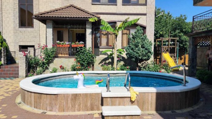 На территории гостевого дома имеется бассейн с подсветкой , подогревом и лежаками для загара, бильярдная, детская площадка с песочницей, батут, кухня со всем необходимым для приготовления пищи, большая беседка с мангалом, зона отдыха во дворе. Для путешествующих на авто предоставляется бесплатная стоянка на территории гостевого дома.
