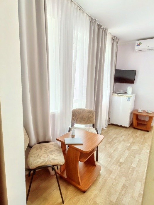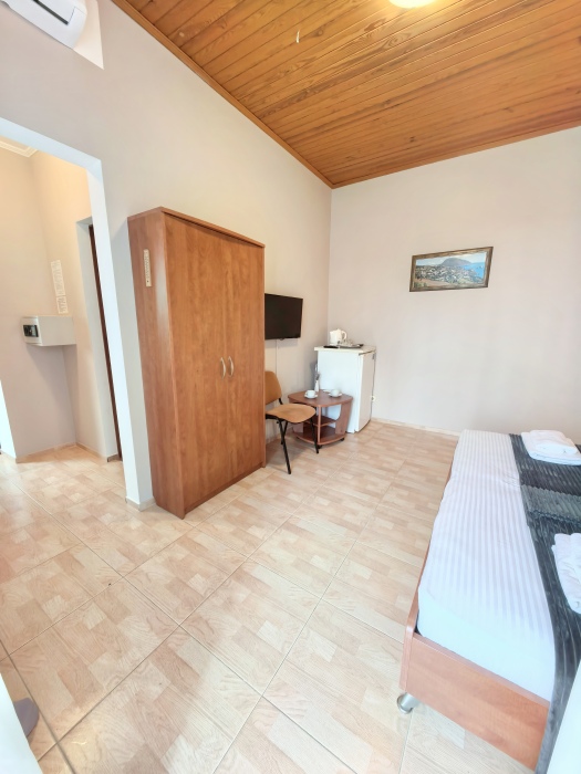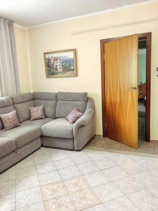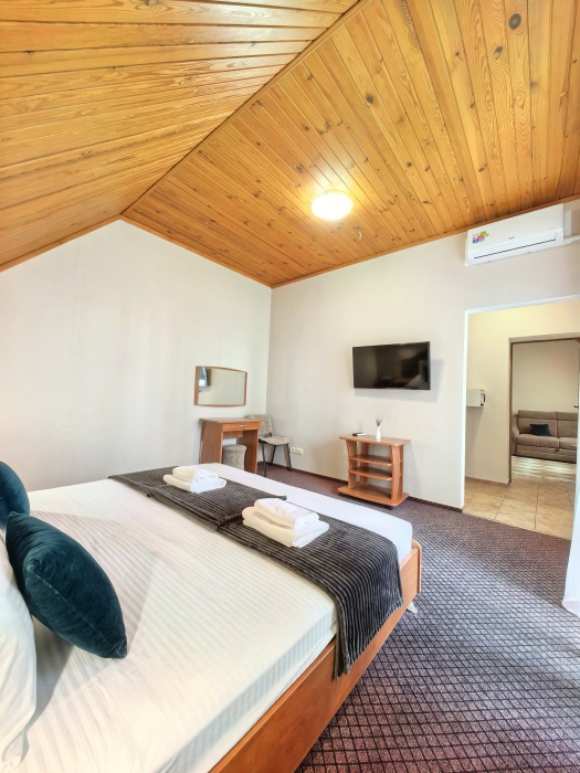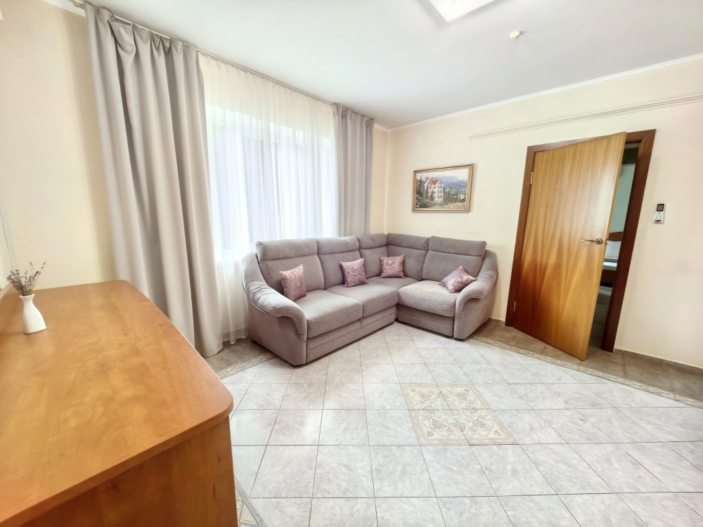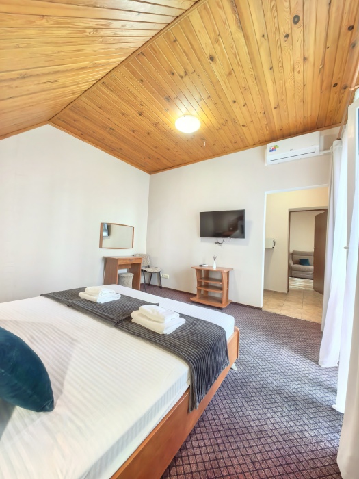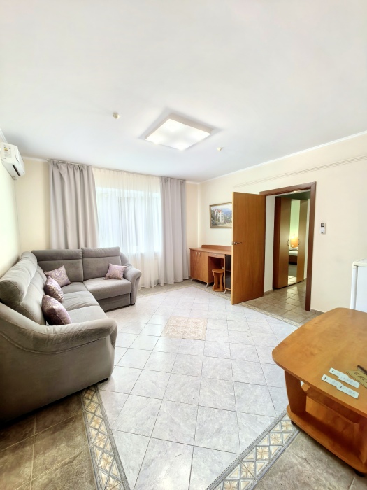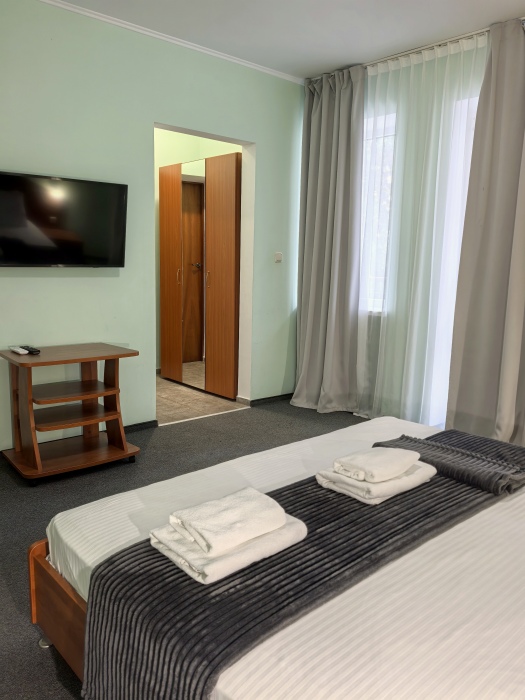 Одна комната – спальня с двуспальной кроватью, с выходом на свой балкон, во второй комнате находится раздвижной угловой диван.