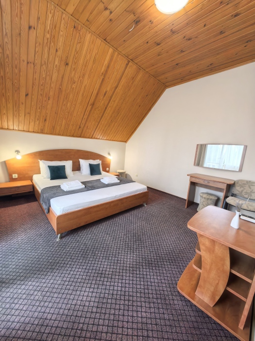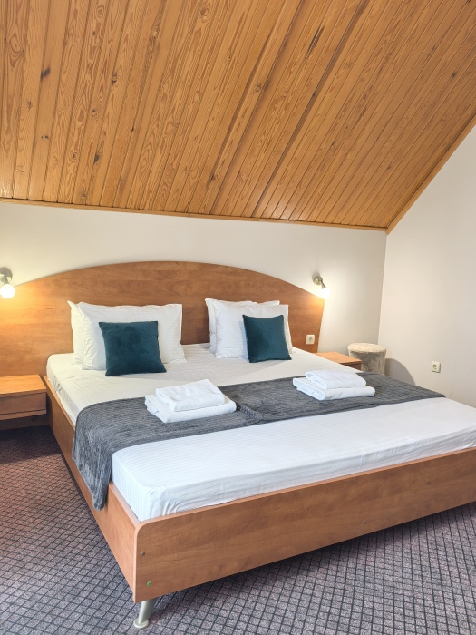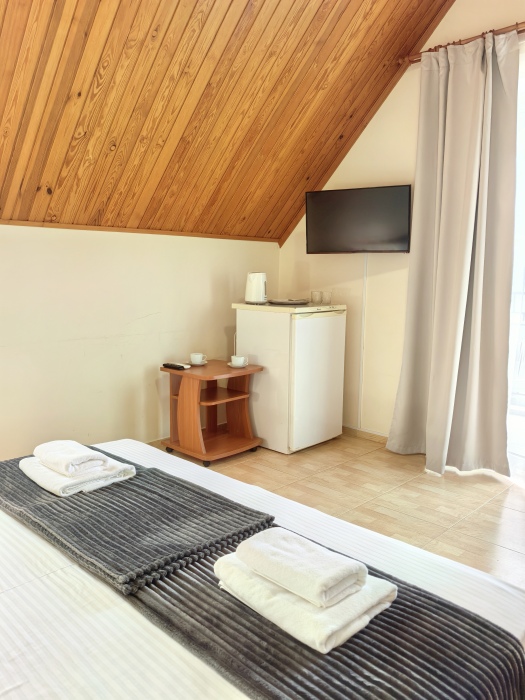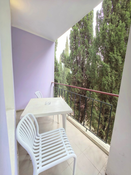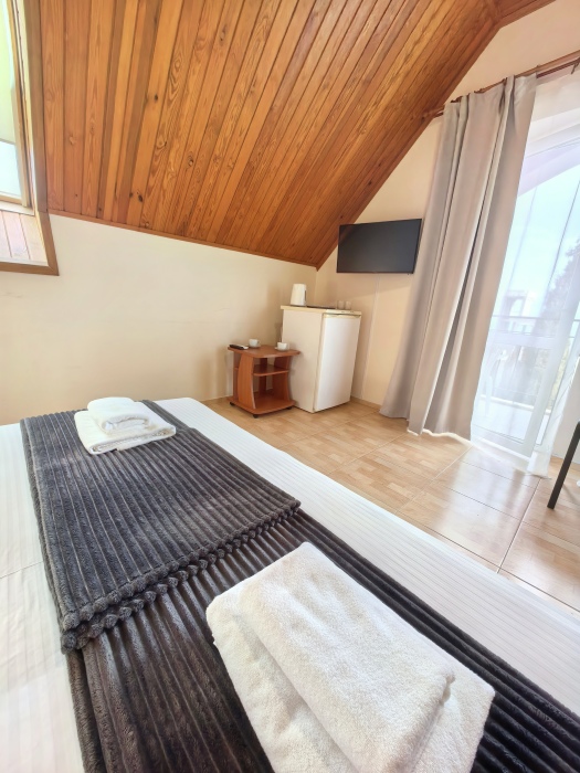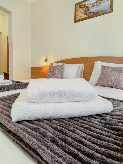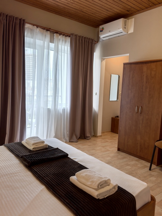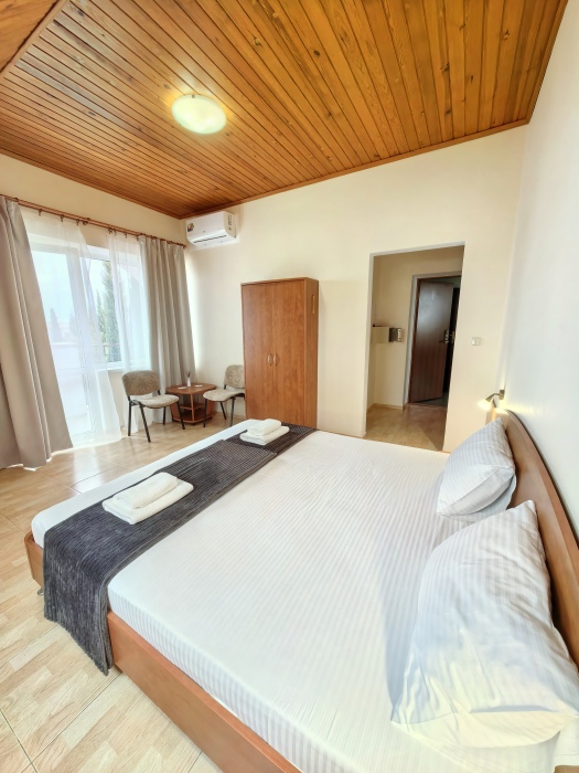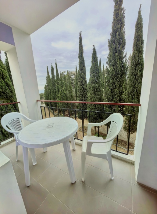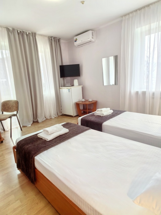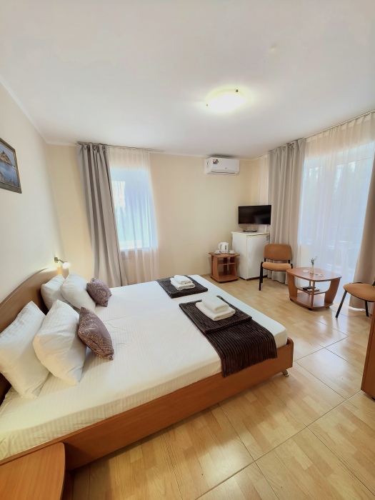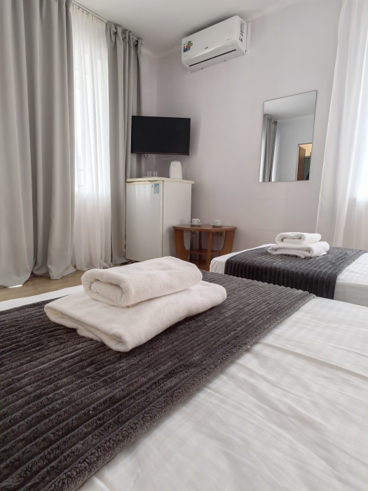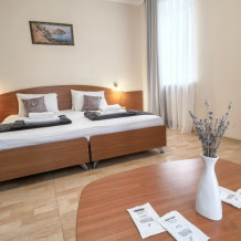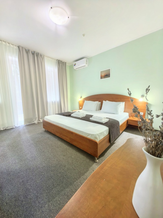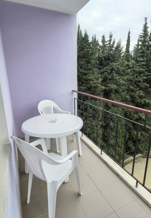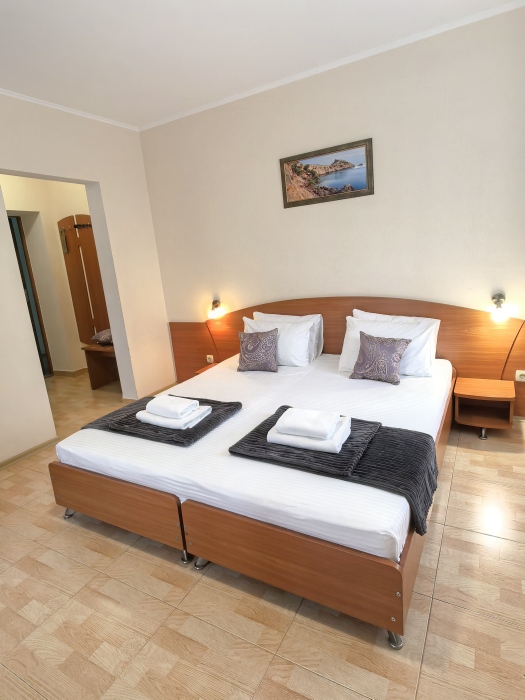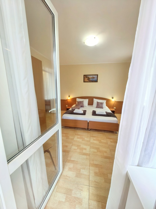 В номере двуспальная или две односпальные кровати на ваш выбор с выходом на свой балкон.