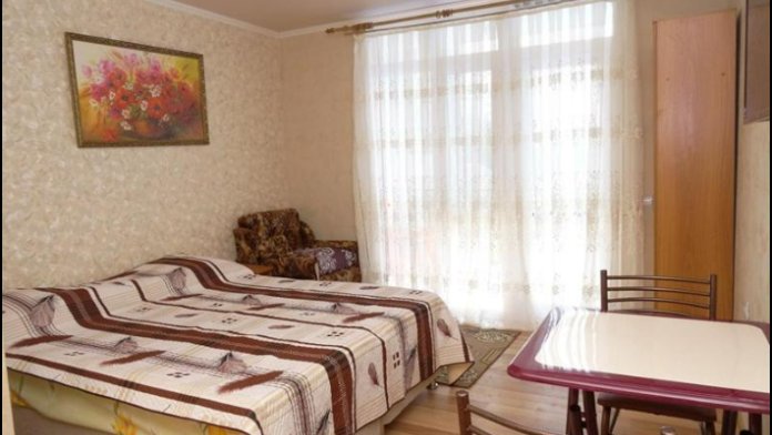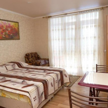 Уютный номер студия со своей кухней. В номере можно разместится семьей 4 человека: две односпальные кровати, которые можно сдвинуть и два кресло-кровати.