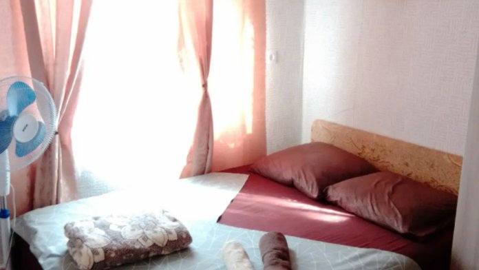 Одна двуспальная и одна 2-ярусная кровати для детей рост до 160 см. Встроенный кондиционер, холодильник, санузел, тумбочки, шкаф для одежды. WI-FI. Душевые кабинки на этаже.Белье и полотенца, туалетная бумага, жидкое мыло, освежитель воздуха предоставляются. Гладильная доска, утюг, сушилка для белья, печь свч, электрочайник с чайным набором на этаже.
