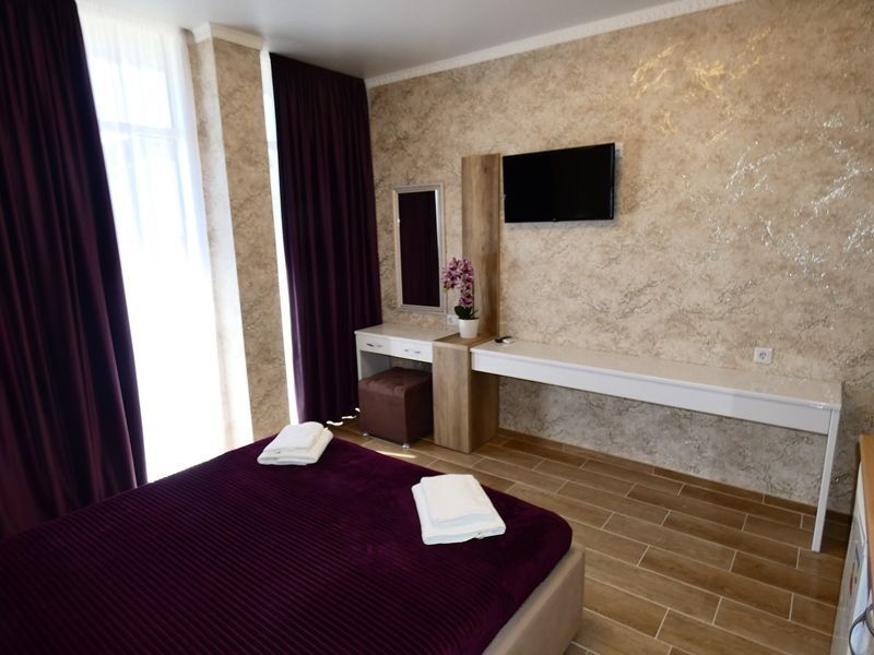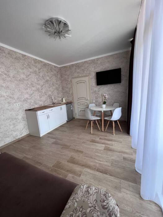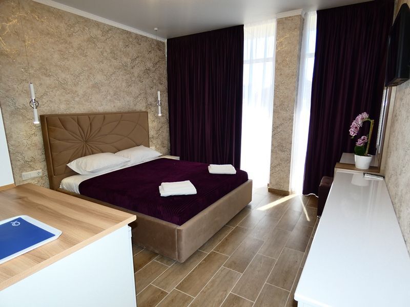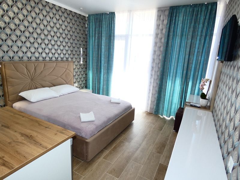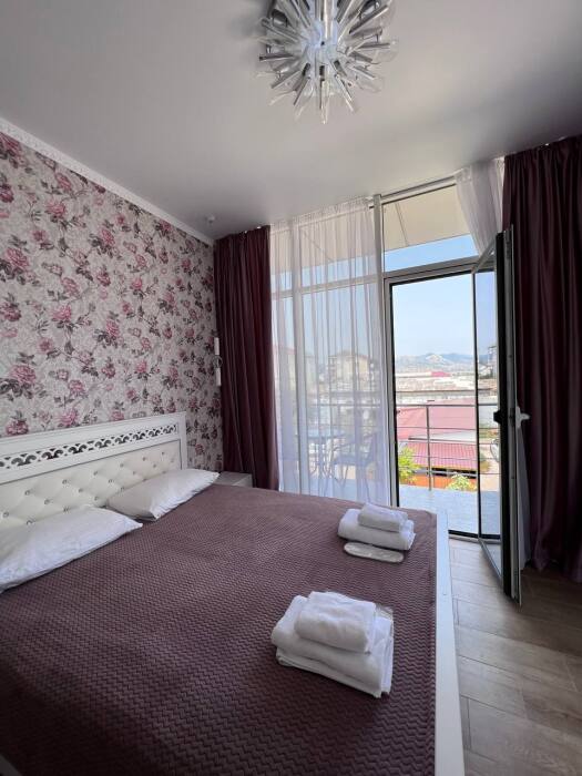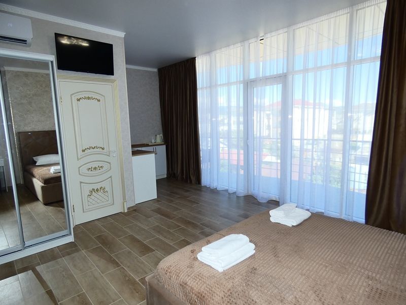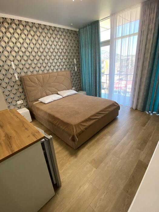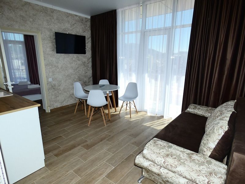 Детали номера: балкон выхода с комнат в разные стороны со столиками и стульчиками, мини-кухня, двухспальная кровать, раскладной диван, санузел, холодильник, телевизор (с встроенным интернетом),