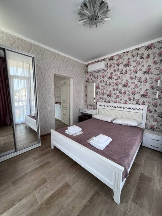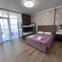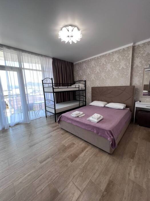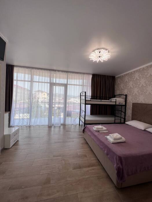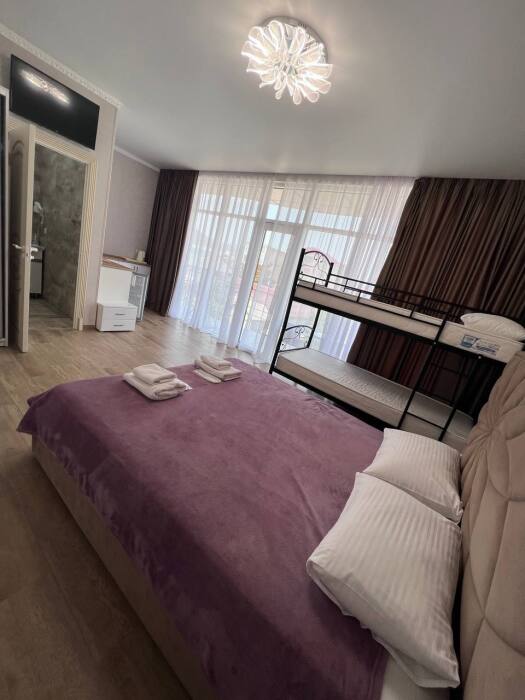 Детали номера: балкон (лоджия) со столиками и стульчиками, двухспальная кровать, двухярусная кровать , санузел, мини-кухня, холодильник, телевизор (с встроенным интернетом), кондиционер, мебель, чайник с чайным набором, полотенца (банные и для рук), фен, туалетные принадлежности (зубная щетка, шампунь, зубная паста, мыло, туалетная бумага), тапочки.